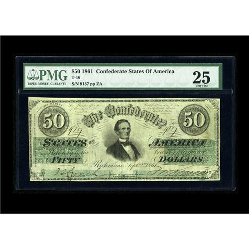 <B>T16 $50 1861.</B></I> This moderately circulated and uncancelled note appears full EF and still boasts solid details. One of the penned signatures ran shortly after it was executed. A pleasing note in all regards with one tiny edge cut noted, a likely result when the note was originally separated from the sheet. <B>PMG Very Fine 25.</B></I><BR><BR><b>Shipping:</b> Coin/Currency (<a target="_blank" href="http://www.heritageauctions.com/common/shipping.php">view shipping information</a>)