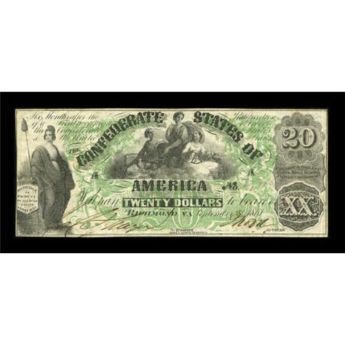 <B>T17 $20 1861.</B></I><BR> This example has one of the better cuts that we have seen on T17s as only the left edge comes into contact with the frame line. The green ink is dark while the folds are generally light. <B>Very Fine</B></I>.<BR><BR><b>Shipping:</b> Coins & Currency (<a target="_blank" href="http://www.heritageauctions.com/common/shipping.php">view shipping information</a>)