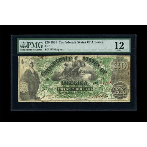 <B>T17 $20 1861.</B></I><BR> This note has been graded <B>PMG Fine 12</B></I> and suffers from some minor staining.<BR><BR><b>Shipping:</b> Coins & Currency (<a target="_blank" href="http://www.heritageauctions.com/common/shipping.php">view shipping information</a>)