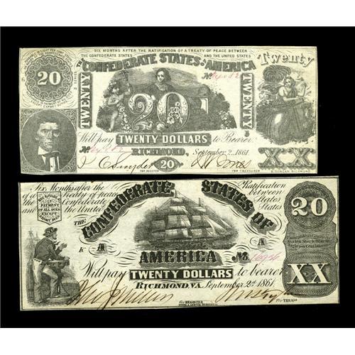 <B>T18 $20 1861 Choice CU</B></I><BR><B>T20 $20 1861 Choice AU.</B></I><BR>A trace of a fold is found on the T20.<BR><I>From The Benjamin Rush Powel Collection of Confederate Currency.</B></I>