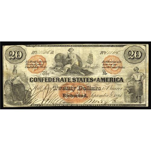 <B>T19 $20 1861.</B></I> Our consignor looked long and hard for this exceptional mid-grade $20 that has merits of nice color, sound edges, and just plain even wear. Also, this example is free of cancels and repairs that are so often found on the notes of this scarce design that only had 14,860 notes issued. This problem-free example will surely please the winning bidder tonight. <B>Fine-Very Fine.</B></I><BR><I>From The Benjamin Rush Powel Collection of Confederate Currency.</B></I> <BR><BR><B>Important notice:<