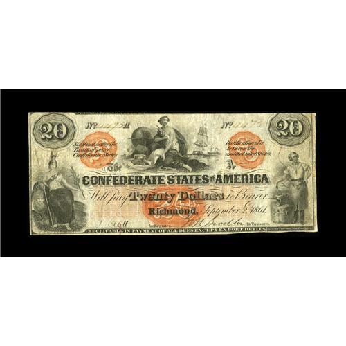 <B>T19 $20 1861.</B></I> The paper quality here is wholly original and the overprint is especially bright for the grade. The last cut cancelled issue in this grade range realized about $3,000, though the CC's were backed by restoration tape of old. <B>Fine-Very Fine.</B></I> This piece is free of any other assistance and should like realize. . .<BR><BR><b>Shipping:</b> Coin/Currency (<a target="_blank" href="http://www.heritageauctions.com/common/shipping.php">view shipping information</a>)
