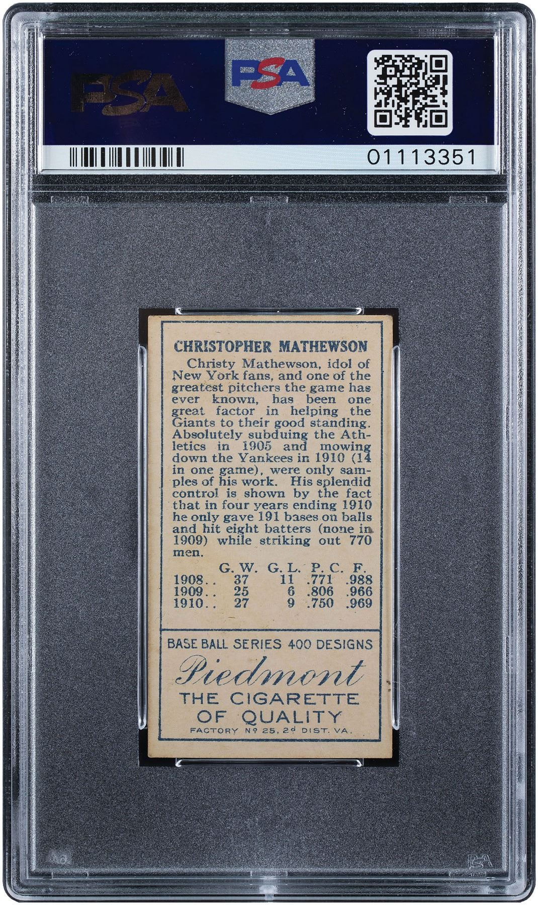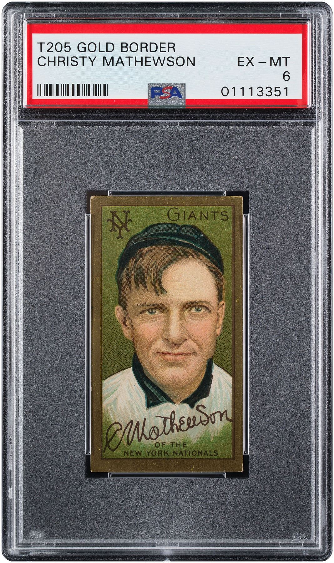 Graded by PSA EX-MT 6. The iconic Mathewson image graces the front of this tremendously attractive card. Well centered with strong color and a perfectly focused image, where you can see every strand of Matty’s hair beneath the cap, and every facial detail. Very light corner touches to the extremities. This is a superior example to most T205 Mathewson cards on the market. Due to the fragile nature of the gold edge borders, the T205 tobacco cards are so difficult to locate in high grade, and were distributed in much smaller numbers than their sister cards, the T206 white borders.