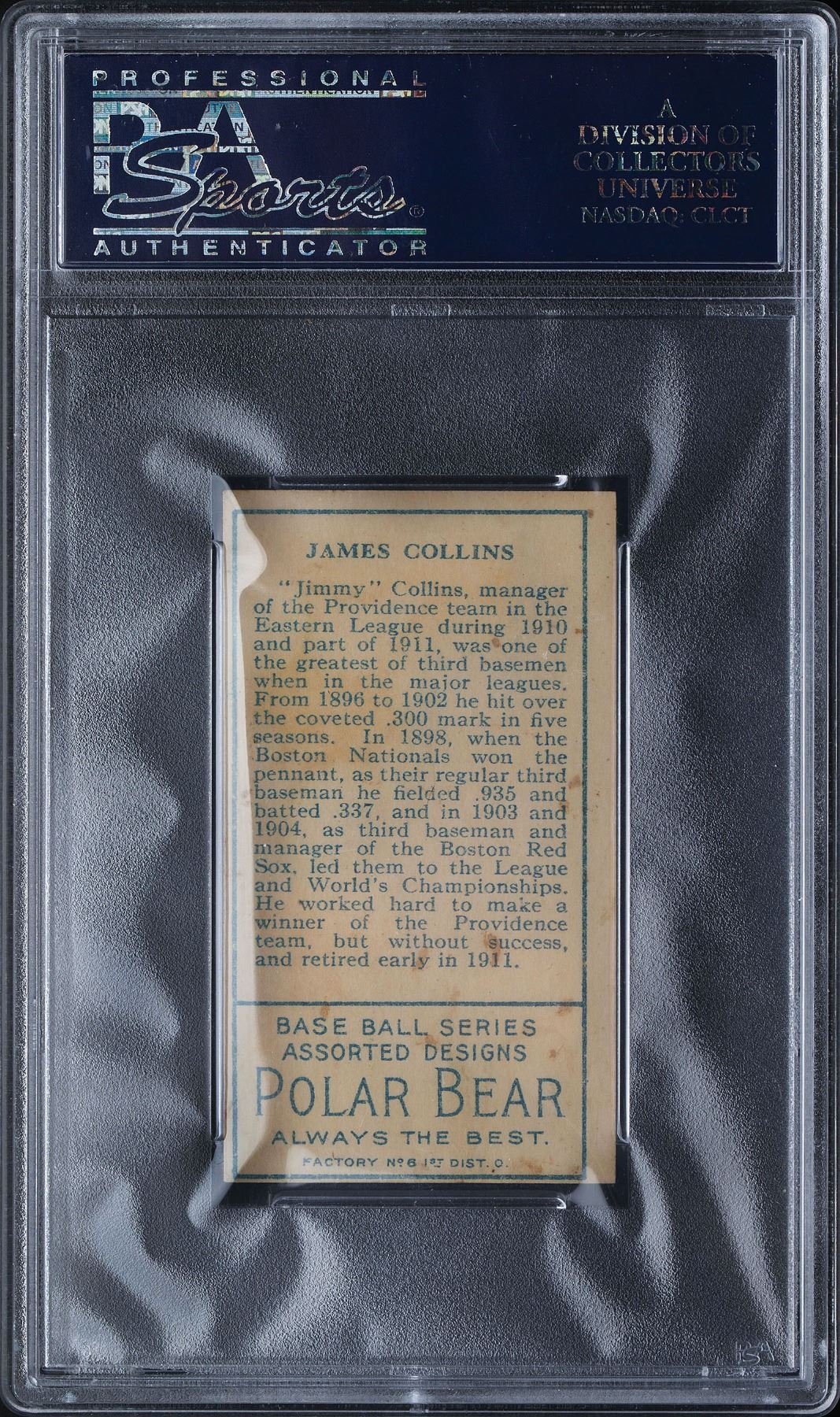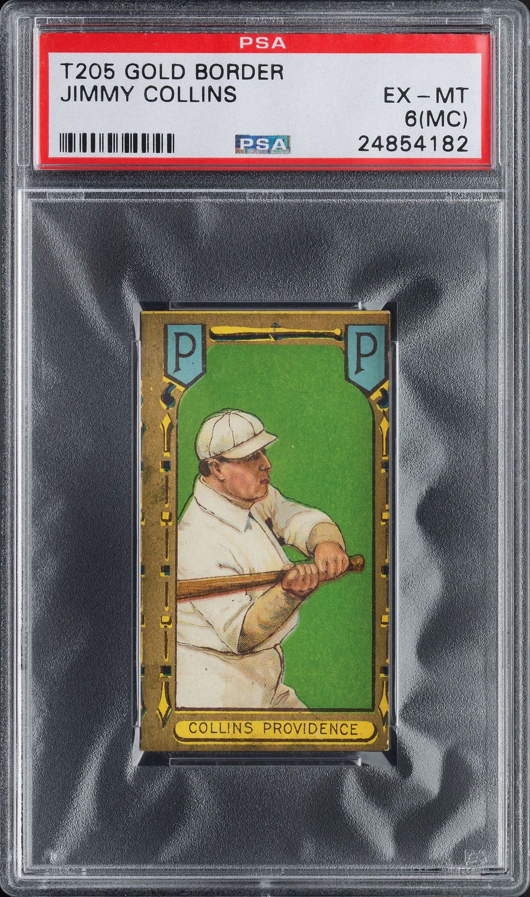 Graded by PSA EX-MT 6 (MC). In the twilight of his Hall of Fame career, Jimmy Collins is a minor leaguer, making this T205 example all the more appealing. Once again, superb print quality and an intensely focused image, with a bold green color and almost full gold border edges. The Polar Bear reverse exhibits the usual light stains.