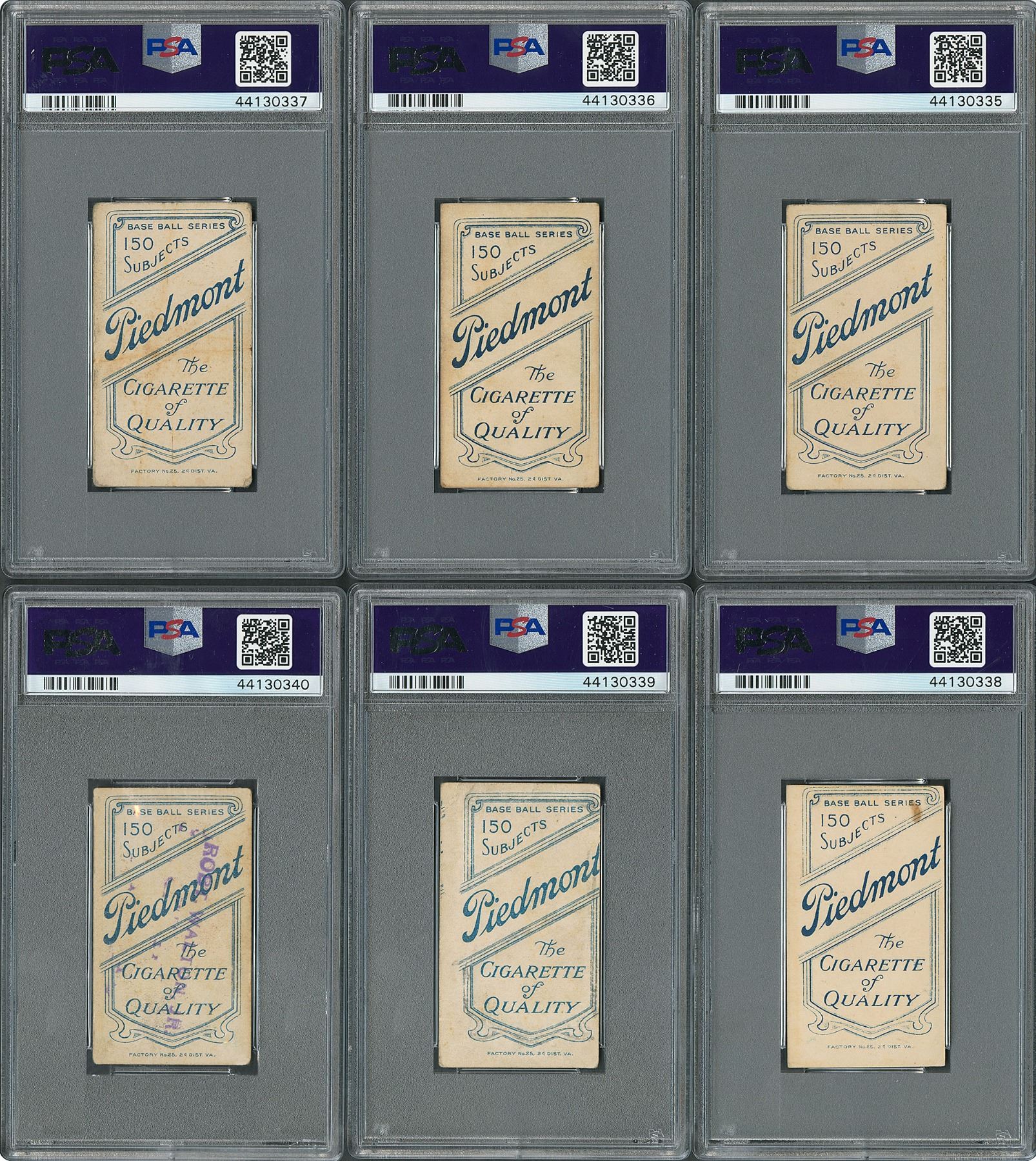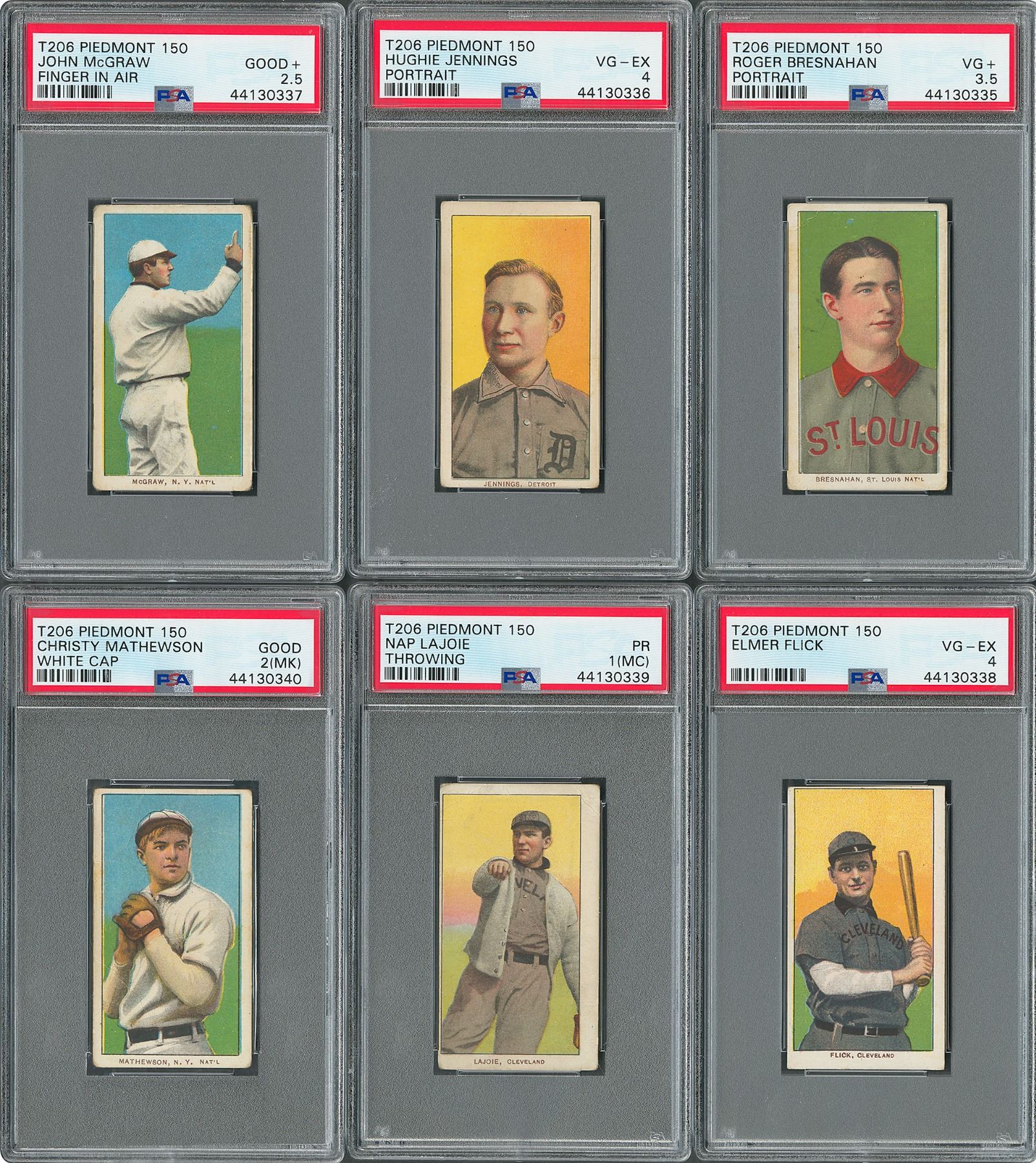 Includes: Roger Bresnahan/portrait (PSA VG+ 3.5), Elmer Flick (PSA VG-EX 4), Nap Lajoie/throwing (PSA POOR 1 MC), Hughie Jennings/portrait (PSA VG-EX 4), John McGraw/finger in air (PSA GOOD 2.5), and Christy Mathewson/white cap (PSA GOOD 2 MK).