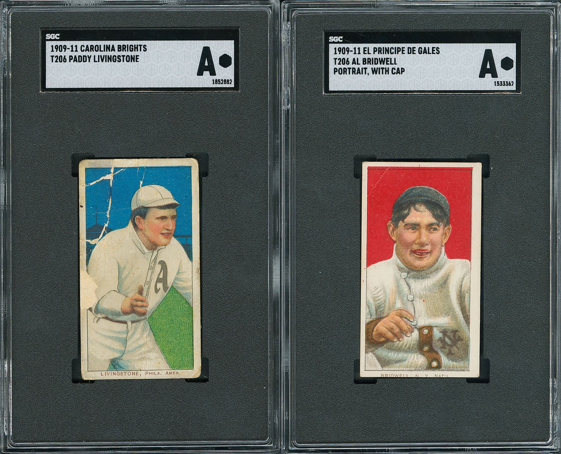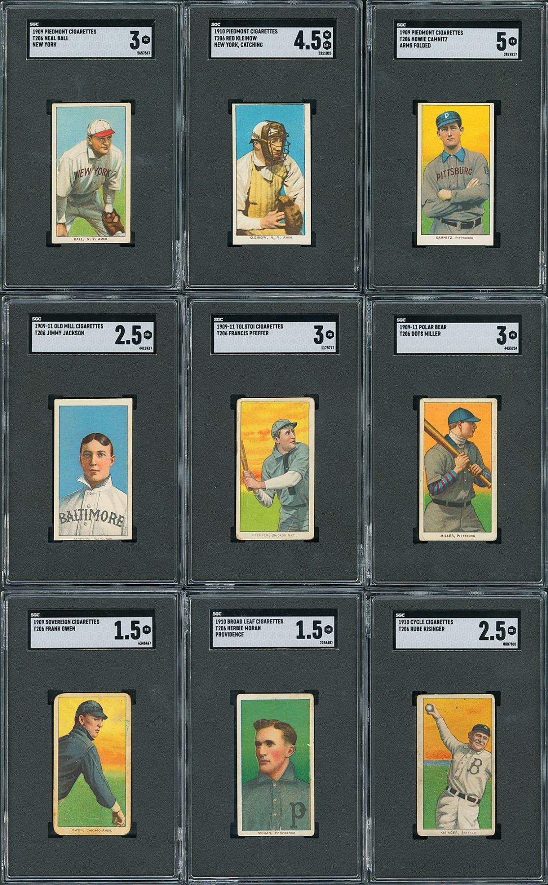 Includes: SGC EX 5 - 1 card, Camnitz Arms Folded (1909 Piedmont). SGC VG-EX+ 4.5 - 1 card, Kleinow New York, and Catching (1910 Piedmont). SGC VG 3 - 3 cards with Ball (1909 Piedmont), Dots Miller (Polar Bear), and Pfeffer (Tolstoi). SGC GOOD+ 2.5 - 2 cards with Jackson Old Mill) and Kisinger (1910 Cycle). SGC FAIR 1.5 - 2 cards with Moran Providence (1910 Broad Leaf) and Frank Owen (1909 Soveriegn). SGC AUTHENTIC - 2 cards with Bridwell with cap (El Principe de Gales) and Livingstone (Carolina Brights).
