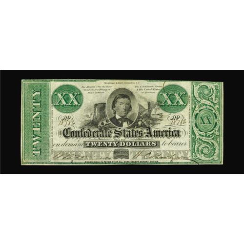 <B>T21 $20 1861.</B></I> A handsome mid-grade <B>Fine-Very Fine</B></I> example with healthy edges and paper to go along with the dark green ink. The paper used for this issue was smuggled into the South from New York City early during the war. <B>Fine-Very Fine.</B></I>