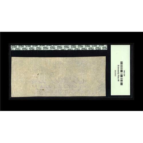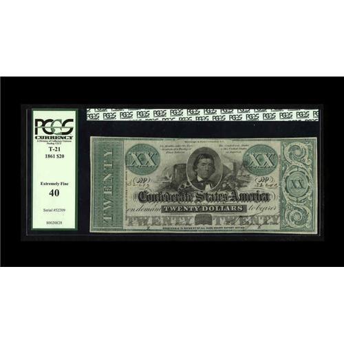 <B>T21 $20 1861.</B></I> Serial number 52209-Z graces this $20. This variety is printed on CSA in script watermarked paper. The Fricke reference has termed this note a T-21 PF-5 CR-147. Its rarity factor is a R-3, scarce, with 201-500 estimated notes to have survived all of these years. This note is listed as the finest known in the Fricke reference, with this note also doubling as the plate note. This is an extremely rare note in higher grades, with only three T-21 PF-5s documented that grade VF or better and are not cut cancelled. <B>PCGS Extremely Fine 40.</B></I> <I>Ex-Fricke.</B></I>