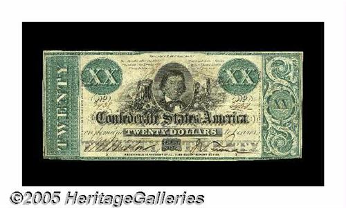 <B>T21 $20 1861.</B></I> This scarce $20 has excellent color and margins save for the bottom edge which is cut very slightly into the design at the right end. It has two neat CCs, but is otherwise flawless. <B>Very Fine,</B></I> with the aforementioned CCs and a couple of old stamp hinges affixed to the back.