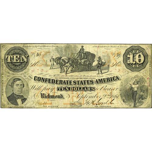 <B>T23 $10 1861.</B></I> This note is printed on red fiber paper and it exhibits sound edges and paper for the grade. Written collector notations are found on the back. Problem-free <B>Fine.</B></I>