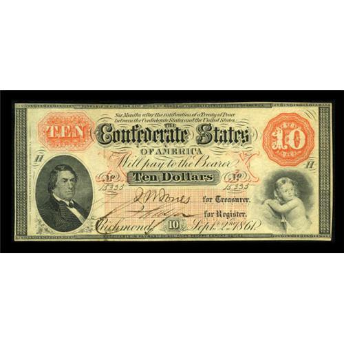 <B>T24 $10 1861 PF-1, Cr. 156.</B></I><BR> Uncirculated at first glance, a broad corner fold is finally noticed on this note that is just short of the Fricke condition census top ten. <B>Choice About Uncirculated.</B></I><BR><BR><b>Shipping:</b> Coins & Currency (<a target="_blank" href="http://www.heritageauctions.com/common/shipping.php">view shipping information</a>)