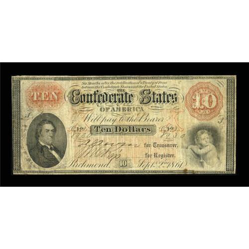 <B>T24 $10 1861. TEN watermark variety.</B></I><BR> The edges are sound on this $10 with the rare "TEN" watermark. <B>Fine.</B></I><BR><BR><b>Shipping:</b> Coins & Currency (<a target="_blank" href="http://www.heritageauctions.com/common/shipping.php">view shipping information</a>)