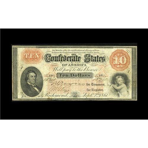 <B>T24 PF-1 $10 1861.</B></I> Bright with sound edges and crisp paper is this lovely mid-grade example. <B>Fine-Very Fine.</B></I>