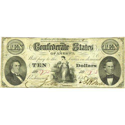 <B>T25 PF-2 $10 1861.</B></I> This $10 with a corrected serial number is bright with even wear and just a couple of trivial edge blemishes. <B>Fine-Very Fine.</B></I>