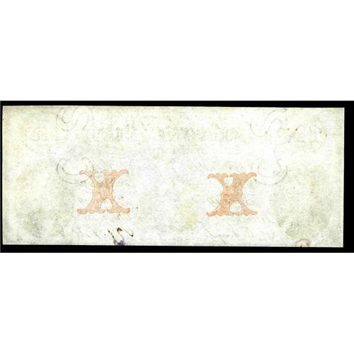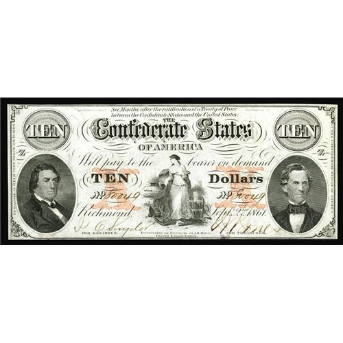 <B>T26 $10 1861.</B></I> Nice margins and a small moisture spot along with a hint of edge roughness is found on this <B>Crisp Uncirculated</B></I> Coarse Lace variety. It is still a serious candidate for the Fricke condition census top ten. The order of emission of the three subtypes for this Criswell number was Fine Lace, Solid Overprint, and then Coarse Lace.<BR><I>From The Benjamin Rush Powel Collection of Confederate Currency.</B></I>
