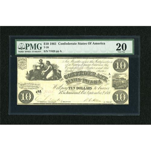 <B>T28 $10 1861.</B></I><BR> A pleasing mid grade example with a lone pinhole. <B>PMG Very Fine 20.</B></I><BR><BR><b>Shipping:</b> Coins & Currency (<a target="_blank" href="http://www.heritageauctions.com/common/shipping.php">view shipping information</a>)<BR><BR><B>Im
