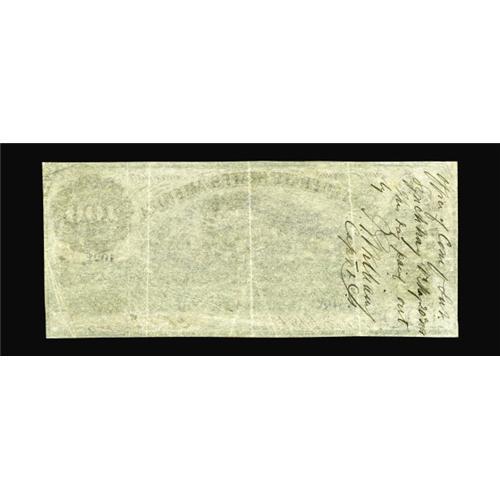 <B>T3 $100 1861.</B></I> This note recently surfaced and its serial number had not been recorded previously by any Confederate scribe. This Montgomery $100 has natural paper surfaces and dark green ink. There is also a Lynchburg 1861 endorsement on the back. The edges and colors are wholesome. <B>Very Fine-Extremely Fine.</B></I>