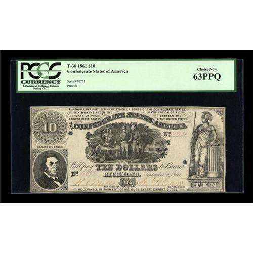 <B>T30 $10 1861.</B></I><BR> Though a touch slim, margins are noted on all four sides of this wholly original issue. The paper is perfect and bright for the issue. <B>PCGS Choice New 63PPQ.</B></I><BR><BR><b>Shipping:</b> Coins & Currency (<a target="_blank" href="http://www.heritageauctions.com/common/shipping.php">view shipping information</a>)