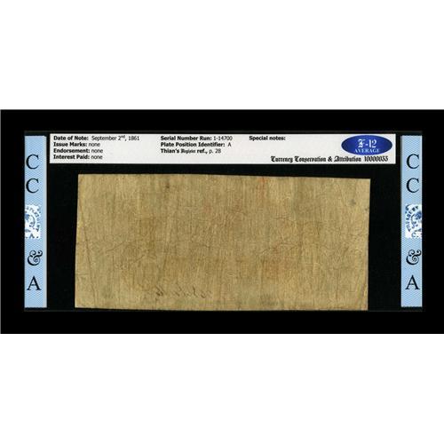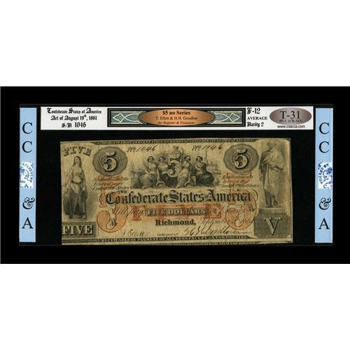 <B>T31 $5 1861.</B></I> This <B>Fine</B></I> example is a PF-1, and is signed by Ellett as Register and Goodloe as Treasurer.<BR><BR><b>Shipping:</b> Coin/Currency (<a target="_blank" href="http://www.heritageauctions.com/common/shipping.php">view shipping information</a>) <BR><BR><B>Important no