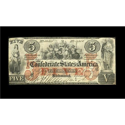 <B>T31 $5 1861.</B></I> This <B>Fine,</B></I> CC example of this popular design shows evidence in its back four corners of once being mounted. Still, plenty of positive merits for the grade on this $5 that carries the scarcer the C plate letter. <BR><BR><B>Important no