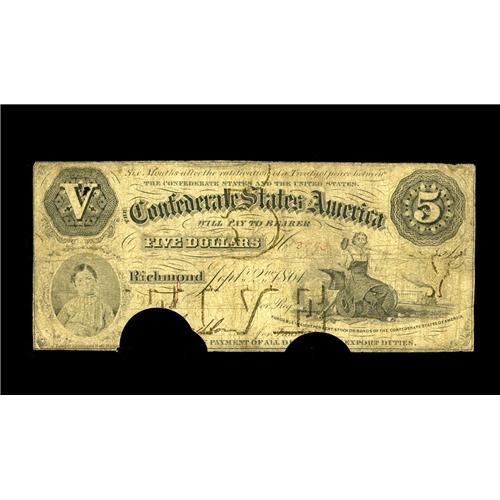 <B>T32 $5 1861.</B></I> The edges show light handling for the grade, while a small hole is found in the upper left counter of this better Confederate type. <B>Very Good,</B></I> COC.