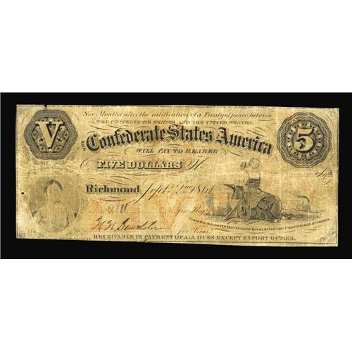 <B>T32 $5 1861.</B></I> This "Blacksmith & Boy" issue has a couple of pinholes and a tiny notch out at upper left, but still retains some of the orange ink. <B>Very Good+.</B></I>