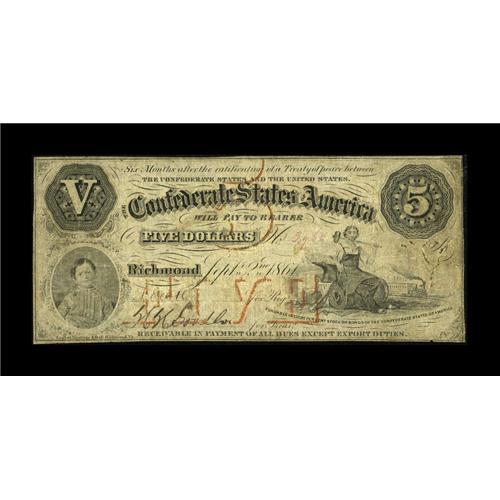 <B>T32 $5 1861.</B></I> This is an elusive issue with this example having even wear and wholesome edges save for one tiny nick. It is a common phenomenon for the overprint of this design to fade due to circulation and/or the elements. <B>Fine.</B></I><BR><BR><b>Shipping:</b> Coins & Currency (<a target="_blank" href="http://www.heritageauctions.com/common/shipping.php">view shipping information</a>)
