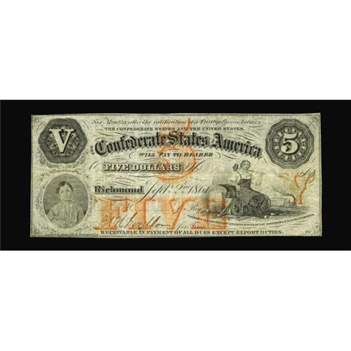 <B>T32 $5 1861.</B></I> This is an example of the rare PF-3 variety that has the AA plate letter. This $5 with serial number 24-AA is the Fricke plate note. It is also the top note in the condition census and a full grade above its nearest competitor. Fricke has tracked a mere six notes of only 133 printed. Of that six, three have been off the market since 1980. Sound edges and even wear highlight this note that extolls the numismatic virtues of rarity and condition. <B>Fine-Very Fine.</B></I>