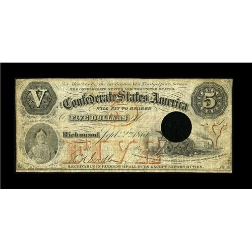 <B>T32 PF-1 $5 1861.</B></I> The overprint has not oxidized on this example and it also has faded just a little. <B>Fine,</B></I> HOC.<BR><BR><b>Shipping:</b> Coin/Currency (<a target="_blank" href="http://www.heritageauctions.com/common/shipping.php">view shipping information</a>) <BR><BR><B>Important n