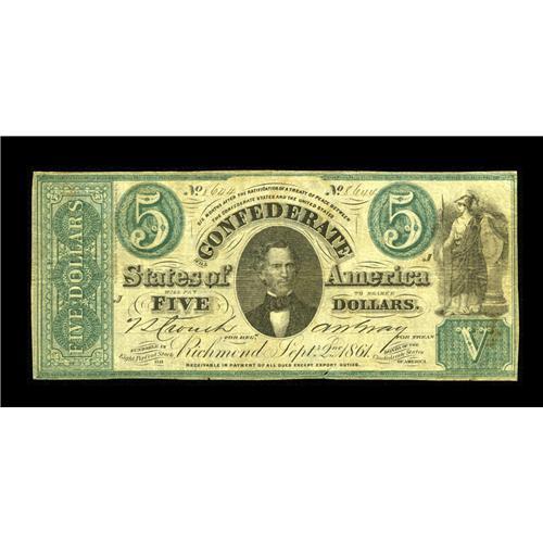 <B>T33 $5 1861.</B></I> This <B>Fine</B></I> example suffers from a couple of small internal tears to the left of portrait, and a small tear at bottom center.<BR><BR><b>Shipping:</b> Coin/Currency (<a target="_blank" href="http://www.heritageauctions.com/common/shipping.php">view shipping information</a>) <BR><BR><B>Importa