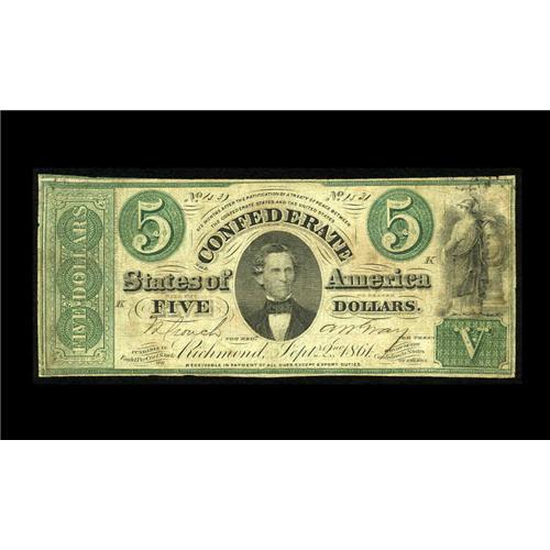 <B>T33 $5 1861.</B></I> Some snap remains on this $5 that has avoided the ink spotting that is often seen on this type. <B>Very Good-Fine.</B></I> <BR><BR><B>Important notice:<