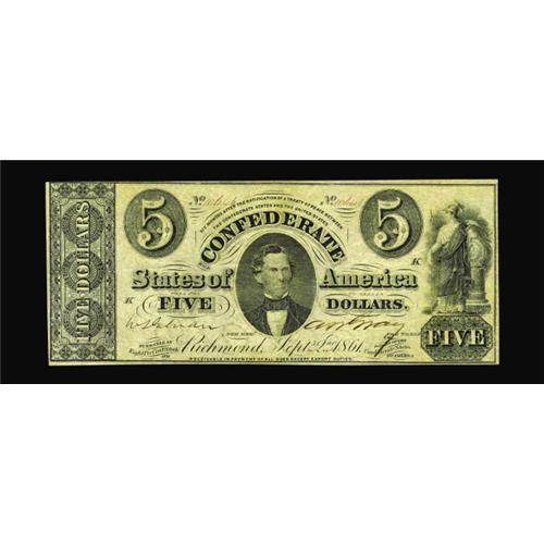 <B>T34 $5 1861.</B></I> Bold embossing highlights this note that exhibits a full frame line. <B>Choice About Uncirculated.</B></I>