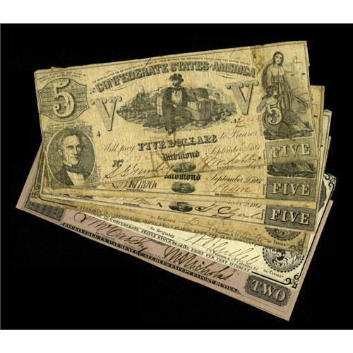 <B>T36 $5 1861 (2) VG; Fine-VF, once mounted, reissue stamp</B></I><BR><B>T37 $5 1861 (3) VG; VG; Fine-VF, CC</B></I><BR><B>T54 $2 1862 XF.</B></I><BR><I>From The George P. Hammerly Collection</B></I><BR><BR><b>Shipping:</b> Coin/Currency (<a target="_blank" href="http://www.heritageauctions.com/common/shipping.php">view shipping information</a>)