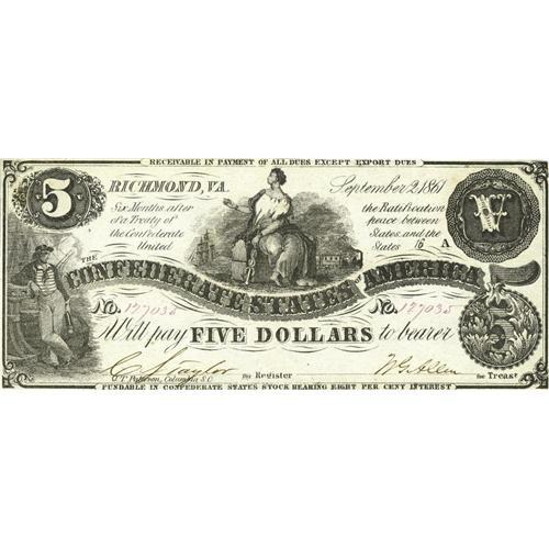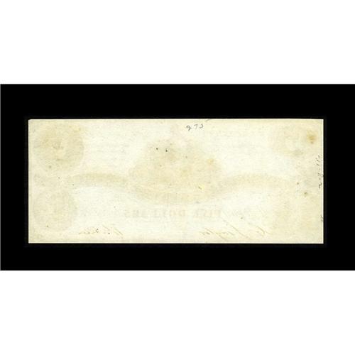 <B>T36 $5 1861.</B></I> Bright paper and a pre-printing paper crinkle are noticed on this $5. The bottom edge extends inside the frame line as this issue is seldom found fully framed. A few pencilled collector notations are on the back. <B>Crisp Uncirculated.</B></I>