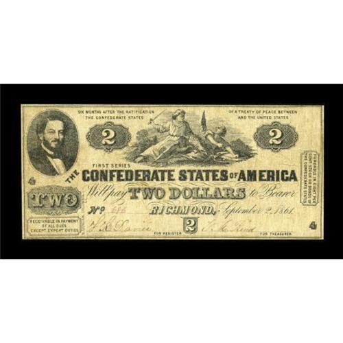 <B>T38 $2 1861 Cr. 286 PF-1.</B></I><BR> This note truly is a scarce issue as no Confederate notes below $5 were authorized and intended to circulate in 1861. The date was incorrectly engraved as 1861 instead of 1862. This<B> Fine </B></I>example is completely framed, as most notes encountered from this issue have awkward cuts, at best. Pinholes are noted, however, due to the lower quality paper used for this type, these are to be expected. Simply a Choice note that should be considered heavily for those wanting to build an upper-end collection of CSA notes.<BR><BR><b>Shipping:</b> Coins & Currency (<a target="_blank" href="http://www.heritageauctions.com/common/shipping.php">view shipping information</a>)