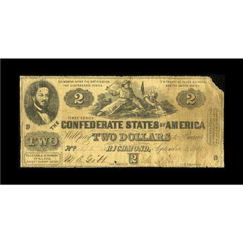<B>T38 $2 1861.</B></I> This <B>Very Good</B></I> example displays the typical pinholes and edge tears for the grade, however, is missing the upper right corner. Fortunately this does not affect any of the design or statements on the note.<BR><BR><b>Shipping:</b> Coin/Currency (<a target="_blank" href="http://www.heritageauctions.com/common/shipping.php">view shipping information</a>)