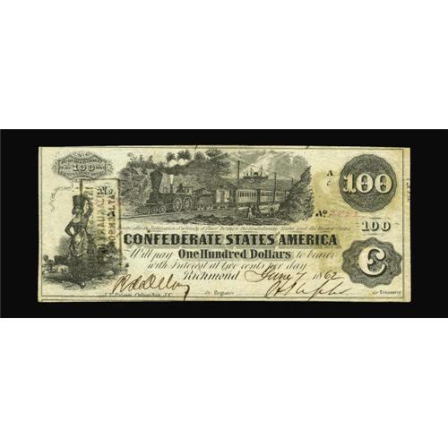 <B>T39 $100 1862.</B></I> A highly collectible "Mobile Savings Bank" black rubber validation stamping is found on this lightly handled <B>About Uncirculated</B></I> C-note. Many banks had employees just to detect counterfeit paper money. A few pinholes are noticed on this bright note.
