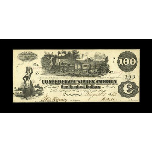 <B>T39 $100 1862.</B></I> Confederate agent Henry Savage's interest stamp produces embossing on this <B>Crisp Uncirculated</B></I> $100 with a cut that is mostly outside the frame line.<BR><BR><b>Shipping:</b> Coin/Currency (<a target="_blank" href="http://www.heritageauctions.com/common/shipping.php">view shipping information</a>)
