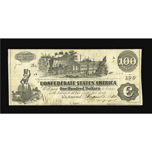 <B>T39 $100 1862.</B></I> This variety shows no clouds above the ship in the central vignette. The paper is beautifully original, though some light folds account for the grade of <B>Very Fine.</B></I><BR><BR><b>Shipping:</b> Coin/Currency (<a target="_blank" href="http://www.heritageauctions.com/common/shipping.php">view shipping information</a>)