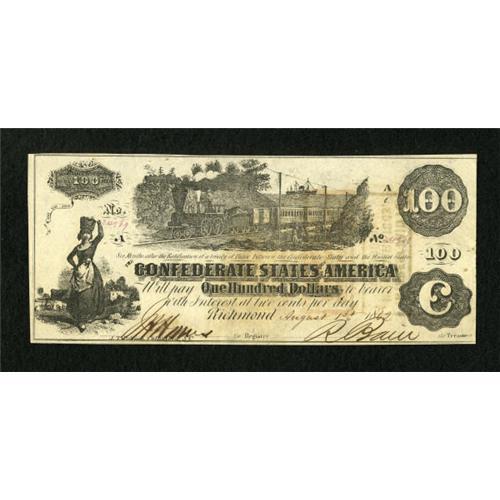 <B>T39 $100 1862.</B></I><BR> This popular variety shows no clouds over the ship in the distance in the center vignette. <B>Uncirculated.</B></I> <BR><BR><b>Shipping:</b> Coins & Currency (<a target="_blank" href="http://www.heritageauctions.com/common/shipping.php">view shipping information</a>)<BR><BR><B>Imp