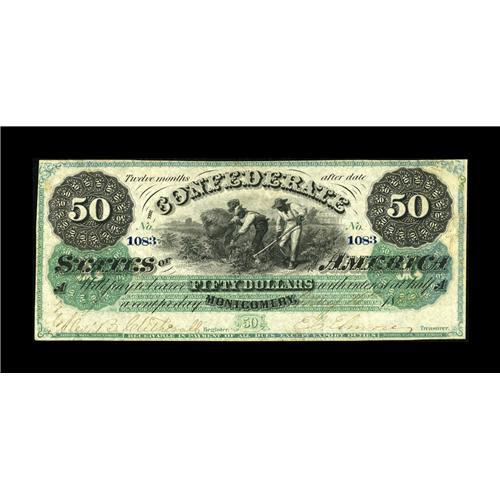 <B>T4 $50 1861.</B></I> This is a new discovery to the Montgomery census of notes, most likely residing in Mr. Bond's collection since the early 1960's. Great color and overall appearance on a note that should grade higher, however, this <B>Very Fine-Extremely Fine</B></I> example has had some well-done restorative work along the right edge that requires close inspection to notice. A bold endorsement on back with an issue date of June 21, 1861, a mere three weeks after the next lot offered.<BR><I>From The William A. "Bill" Bond Collection</B></I><BR><BR><b>Shipping:</b> Coin/Currency (<a target="_blank" href="http://www.heritageauctions.com/common/shipping.php">view shipping information</a>)