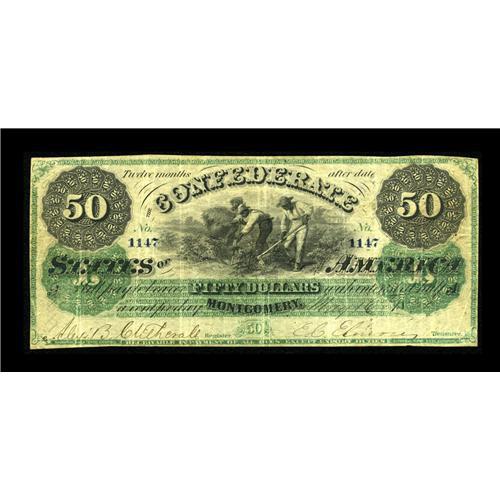 <B>T4 $50 1861.</B></I> This is an attractive <B>Fine-Very Fine</B></I> $50 with nice color and original paper surfaces. There is a small tape repair in the lower right-hand corner. The overall even wear also includes a penned issuance date of May 31, 1861. This is the lowest denomination of the four Confederate notes issued from the first Confederate capital of Montgomery. These notes were printed by the National Bank Note Company in New York City. The notes actually left New York harbor for the Confederacy as Federal agents were running down the dock attempting to confiscate them as enemy contraband.<BR><I>From The George P. Hammerly Collection</B></I><BR><BR><b>Shipping:</b> Coin/Currency (<a target="_blank" href="http://www.heritageauctions.com/common/shipping.php">view shipping information</a>)
