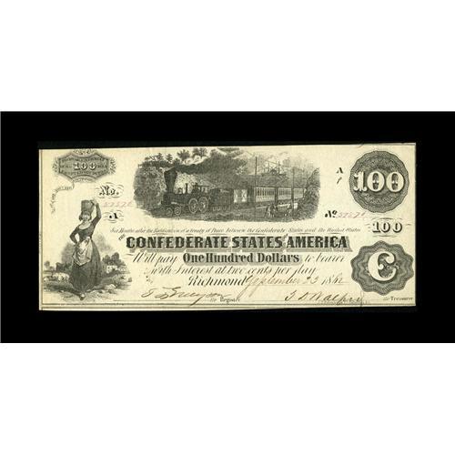 <B>T40 $100 1862.</B></I> Bright paper is found on this C-note with the engraver name of "Hollings" in the left-hand margin. Our Confederate agent, Henry Savage, has left his Wilmington, NC imprint again. <B>Crisp Uncirculated.</B></I><BR><BR><b>Shipping:</b> Coin/Currency (<a target="_blank" href="http://www.heritageauctions.com/common/shipping.php">view shipping information</a>)