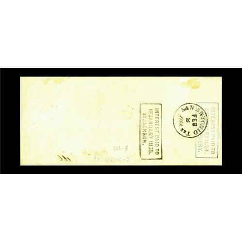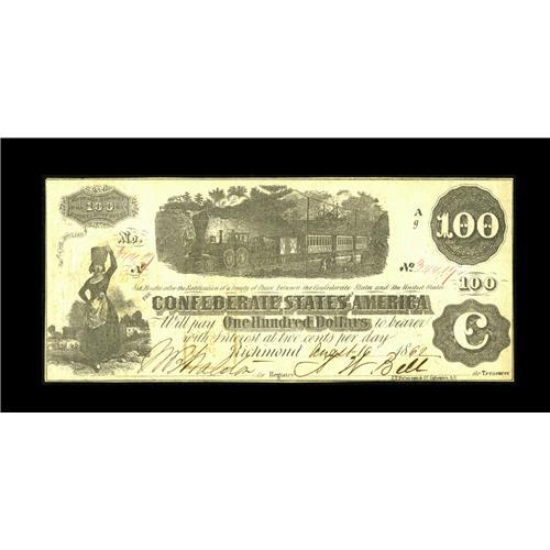 <B>T40 $100 1862.</B></I> Issued in San Antonio, Texas. All Confederate notes issued west of the Mississippi River are scarce, and Texas issues are particularly popular among collectors. Also of note are some pencil notations and some mounting tape residue on back. <B>About Uncirculated</B></I>.