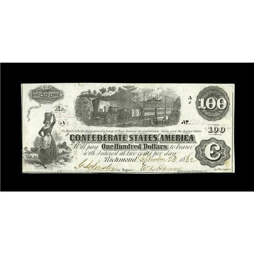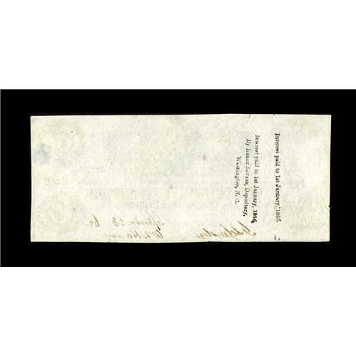 <B>T40 $100 1862.</B></I> This C-note carries a neat interest paid stamp by Henry Savage, Depositary in Wilmington, NC. A slight paper skin is noticed at upper right and a pre-printing paper crinkle has started an approximate quarter inch edge tear. <B>Crisp Uncirculated.</B></I>