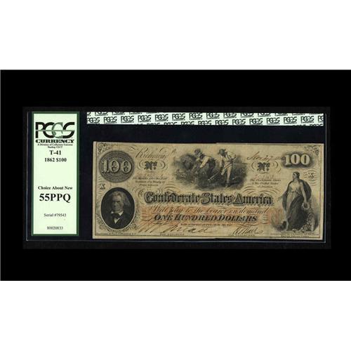 <B>T41 $100 1862.</B></I> Serial number 79543-X is a Scroll 1 variety that carries the T-41 PF-6 CR-319 Fricke qualifier. This rare interest paid T-41 has a previously undocumented depositary, Wm. Witty, of Alexandria, Louisiana. <B>PCGS Choice About New 55PPQ.</B></I> <I>Ex-Fricke.</B></I>