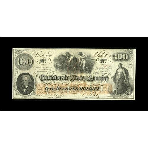 <B>T41 $100 1862.</B></I> This embossed Scroll 1 note is fully framed with red and blue stampings on the back from Montgomery and Macon. <B>Choice Crisp Uncirculated.</B></I><BR><BR><b>Shipping:</b> Coin/Currency (<a target="_blank" href="http://www.heritageauctions.com/common/shipping.php">view shipping information</a>)