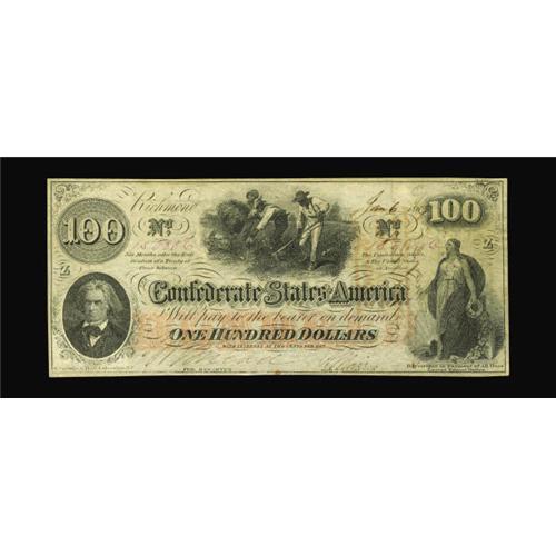 <B>T41 PF-13 $100 1862.</B></I> This wonderful note is a Criswell 330A with the J Whatman 1862 watermark. It also has an 1863 date and it is listed as a rare variety in the Fricke reference. The watermark is easily viewed on this boldly embossed, fully framed <B>About Uncirculated</B></I> example with just a trace of handling. This note easily steps into the Fricke Condition Census for this variety. Another interesting fact about this note is that it was issued by (Major and Quarter Master) A.B. Ragan, who was a member of General Joseph E. Johnston's staff.