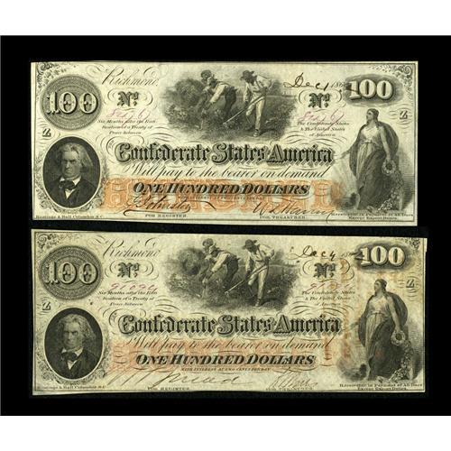 <B>T41 $100 1862 Two Examples.</B></I> The Scroll 1 note grades <B>Choice AU</B></I> with embossing and has John Boston and Macon rubber stampings. The top edge is inside the frame line, too. The Scroll 2 note is embossed and grades <B>CU.</B></I><BR><I>From The George P. Hammerly Collection</B></I><BR><BR><b>Shipping:</b> Coin/Currency (<a target="_blank" href="http://www.heritageauctions.com/common/shipping.php">view shipping information</a>)