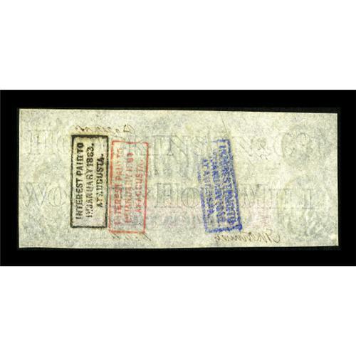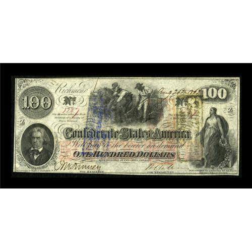 <B>T41 $100 1862 Cr. 314 PF-4.</B></I><BR> One of only thirteen notes known of this variety with the Wookey Hole Mill watermark. This last appeared at auction in May 2005. Listed in the Fricke condition census at #3. This note is over 95% fully margined but for the left end at the top and bottom corners. Three Interest Paid stamps from Augusta are noted on back. <B>Crisp Uncirculated+.</B></I><BR><BR><b>Shipping:</b> Coins & Currency (<a target="_blank" href="http://www.heritageauctions.com/common/shipping.php">view shipping information</a>)